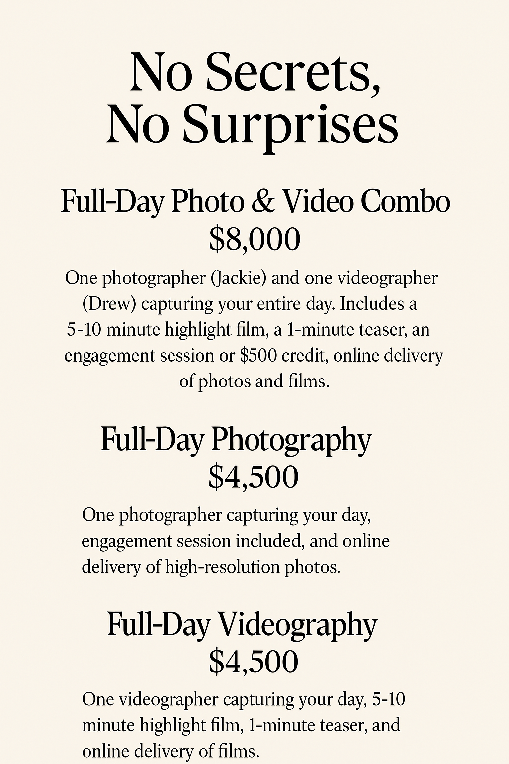 No Secrets, No Surprises We believe pricing should be as clear as your wedding vision. No smoke and mirrors, no hidden fees—just everything laid out upfront so you can focus on what matters: making your day unforgettable. The details are below, so grab a coffee, dive in, and let’s see if we’re the perfect fit!